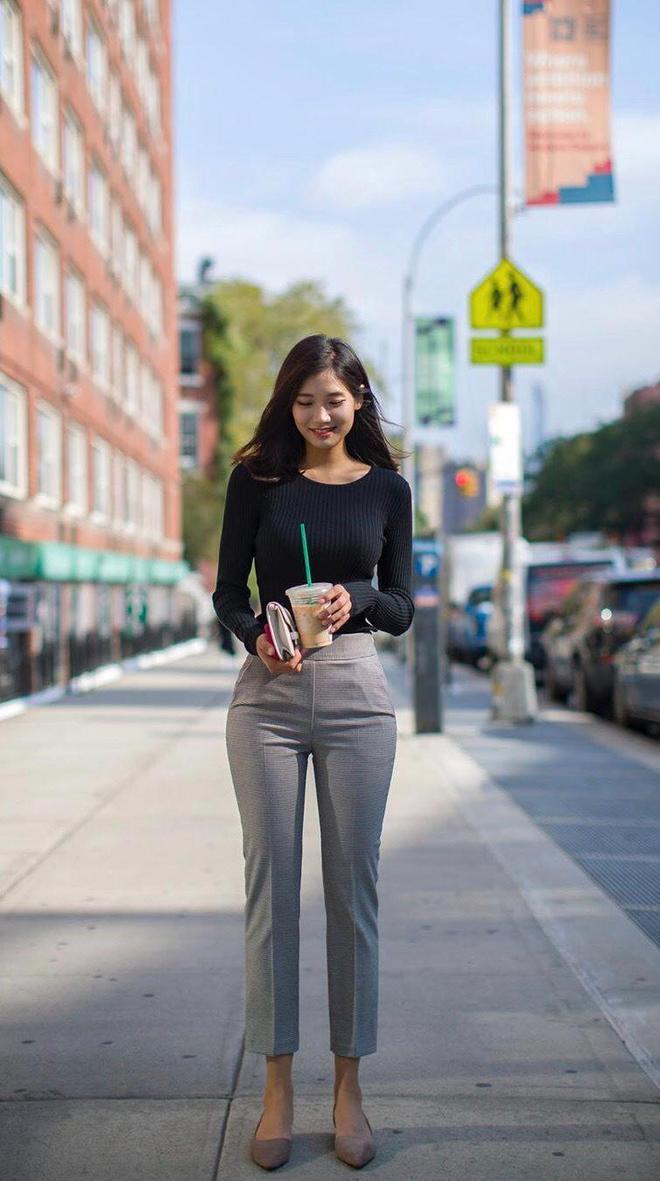 下身搭配一条浅灰的西装裤。浅灰的布质西装裤是最能展现知性美的装备。布艺的材质,让整个裤子的线条十分柔顺,带动着整条腿也是秀气直挺。布裤一定要亲身试穿看看版型,一旦版型不太好,就会让人看起来非常邋遢,或者紧绷到动弹不得。浅灰色一直是优雅的代称,和上身的黑色毛衣相得益彰。微微一笑,连秋日的阳光也变得温暖和煦起来。这一身装扮的另一个要点就是一定不要配大的包包,精致小巧的手持包,放一些必备物品即可。精致是这身装扮的主旋律。