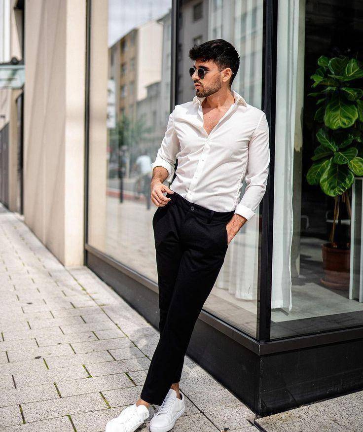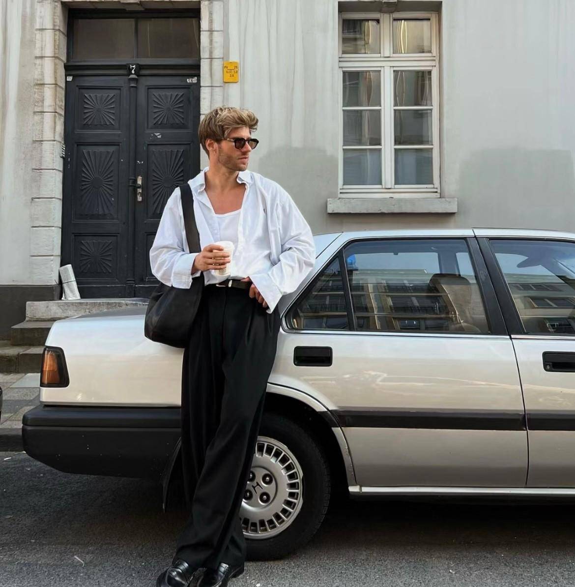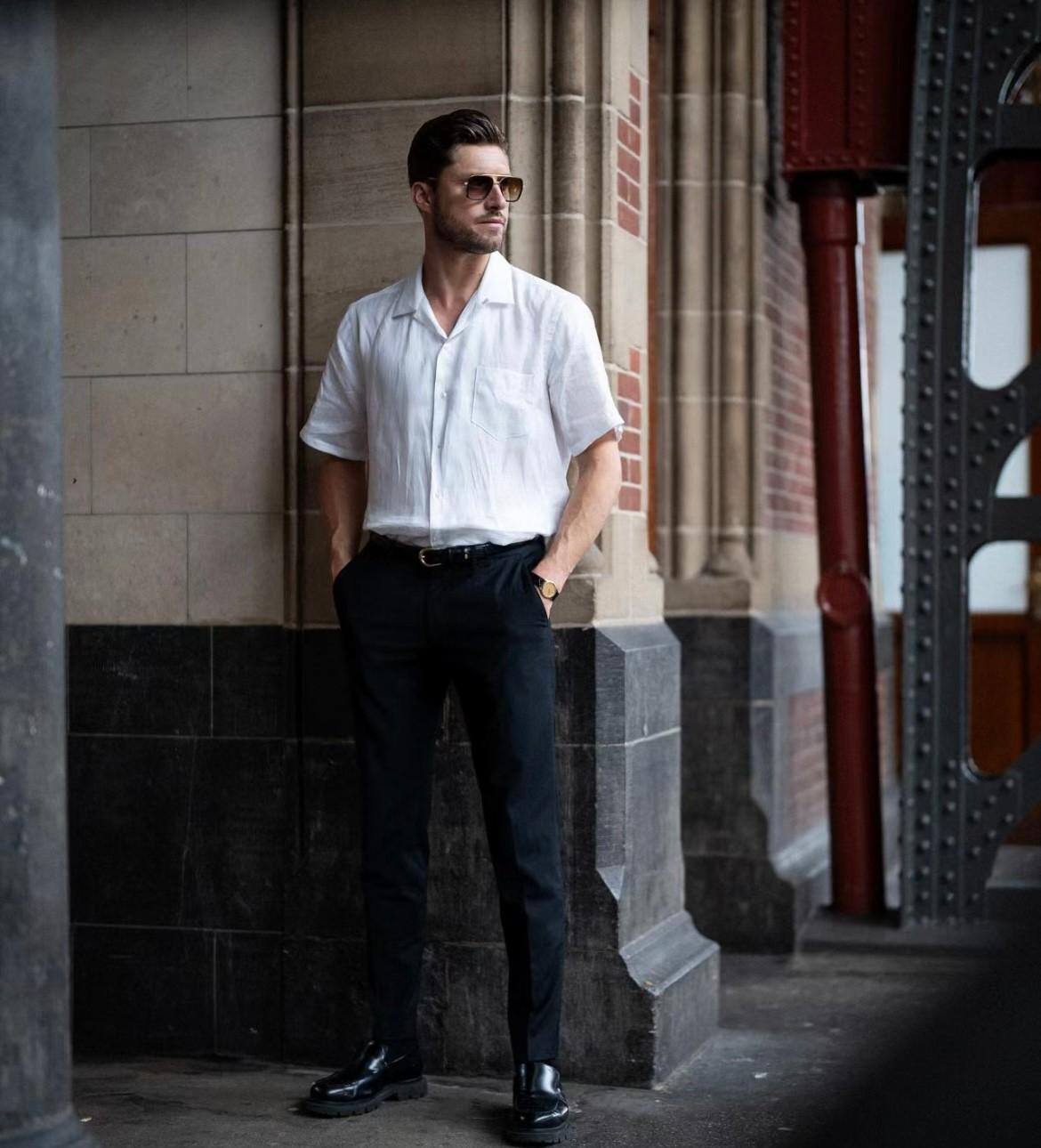 同样是“白衬衫+黑裤子”,但不同的组合会改变衣服的外观。古巴领衬衫的正式和严肃,将直筒裤的风格带到了职场,让整套穿搭更有商务气息。