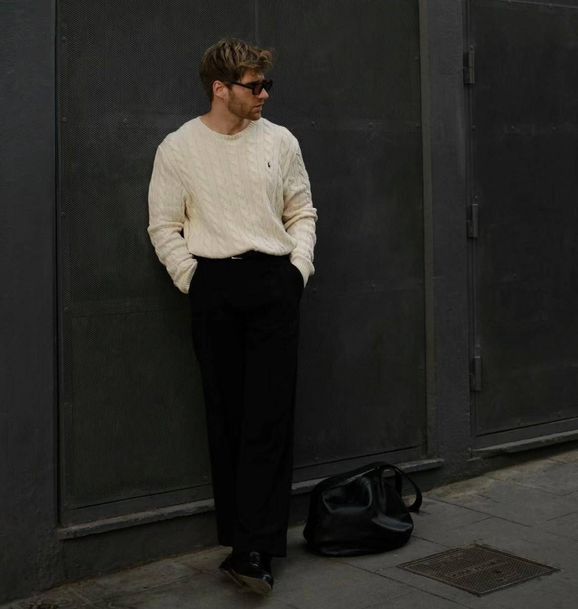 入秋后寒冷会更加强烈,胖人也可以靠米色毛衣+黑色高腰裤来完成文艺造型。简单的全褶皱打造出完美的四分之三点,一双运动鞋或穆勒鞋则体现了法式浪漫。