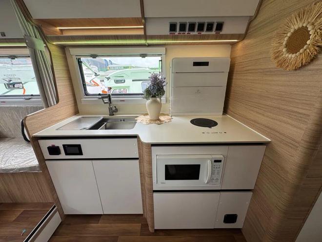 对面是房车的主体厨房区域,L 型橱柜集成有嵌入式电磁炉、大功率家用抽油烟机、微波炉、开放式水槽、独立水龙头等。嵌入式电磁炉节省空间且使用方便,大功率家用抽油烟机能够有效排除烹饪时产生的油烟,保持厨房空气清新。微波炉则可以快速加热食物,满足不同的饮食需求。开放式水槽和独立水龙头方便清洗食材和餐具,为烹饪提供了良好的条件。