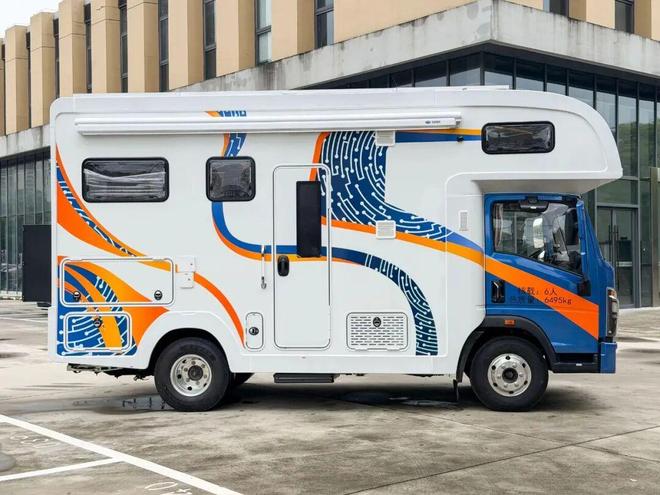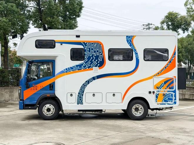 拓锐斯特豪沃轻卡房车在外观上采用了大胆的亮蓝色 + 亮橙色 + 白色的组合,这种鲜明且活泼的色彩搭配,让车辆在众多房车中脱颖而出,极具辨识度。额头上方黑色防撞梁不仅增加了安全性,还与 4 个 LED 探照灯相搭配,营造出一种硬朗且个性十足的视觉效果。整车尺寸为 5995×2550×3380mm,合理的尺寸既保证了内部空间的充裕,又确保了行驶的灵活性。