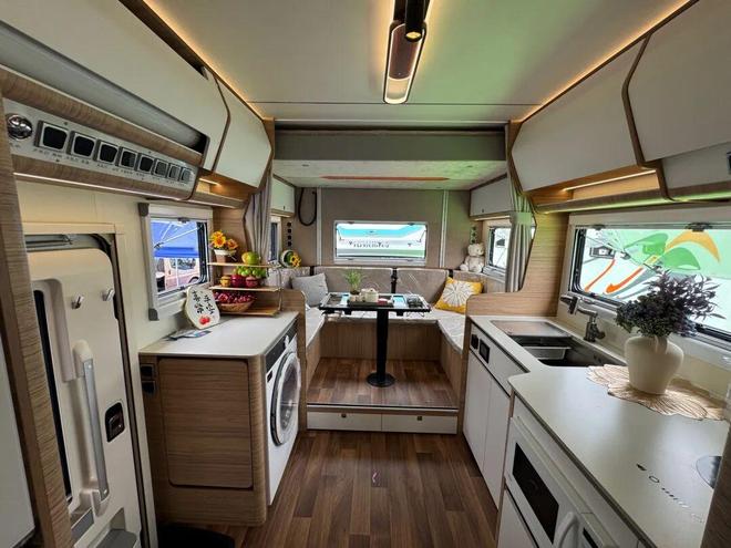 进入生活区,首先映入眼帘的是驾驶室上方的额头床,尺寸为 2200×1400mm,两侧和上方均配备有窗户,保证了良好的通风和采光效果,为乘客提供了一个舒适的休息空间。冰箱位于车门一侧,容量高达 427L 的四开门设计,比大多数人家里的冰箱还要大,能够满足长时间出行的食物储存需求。冰箱右边是带有侧拓展板的操作台面,下方配备一台 10kg 带烘干洗衣机,方便乘客清洗衣物;上方则是 1.5P 家用空调和储物吊柜,为生活提供了便利。