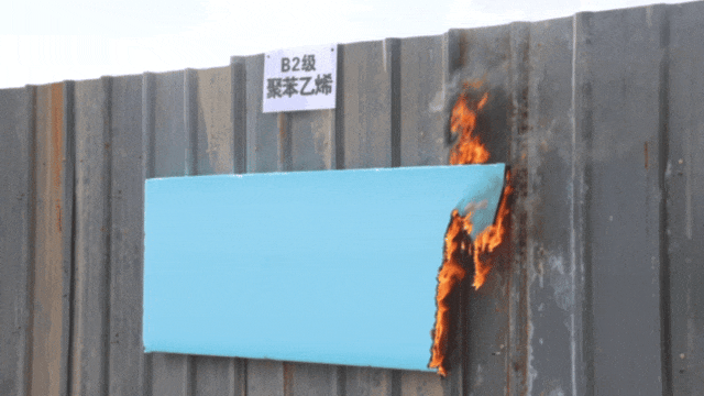 B1级材料(挤塑聚苯乙烯泡沫板)被明火炙烤后,会发生燃烧,离开明火后会立即熄灭。
