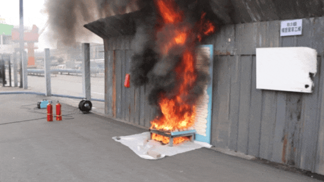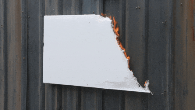 通过实验可以看到,电焊火花掉落在聚氨酯泡沫材料上后,迅速燃起明火并伴随大量黑烟,一分钟不到火势逐渐变大,引燃墙面保温材料。