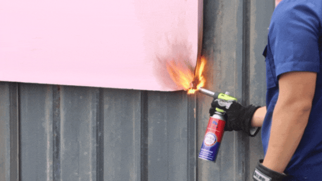 B1级材料(聚异氰脲酸酯)被明火炙烤后,会发生燃烧,离开明火后会立即熄灭。